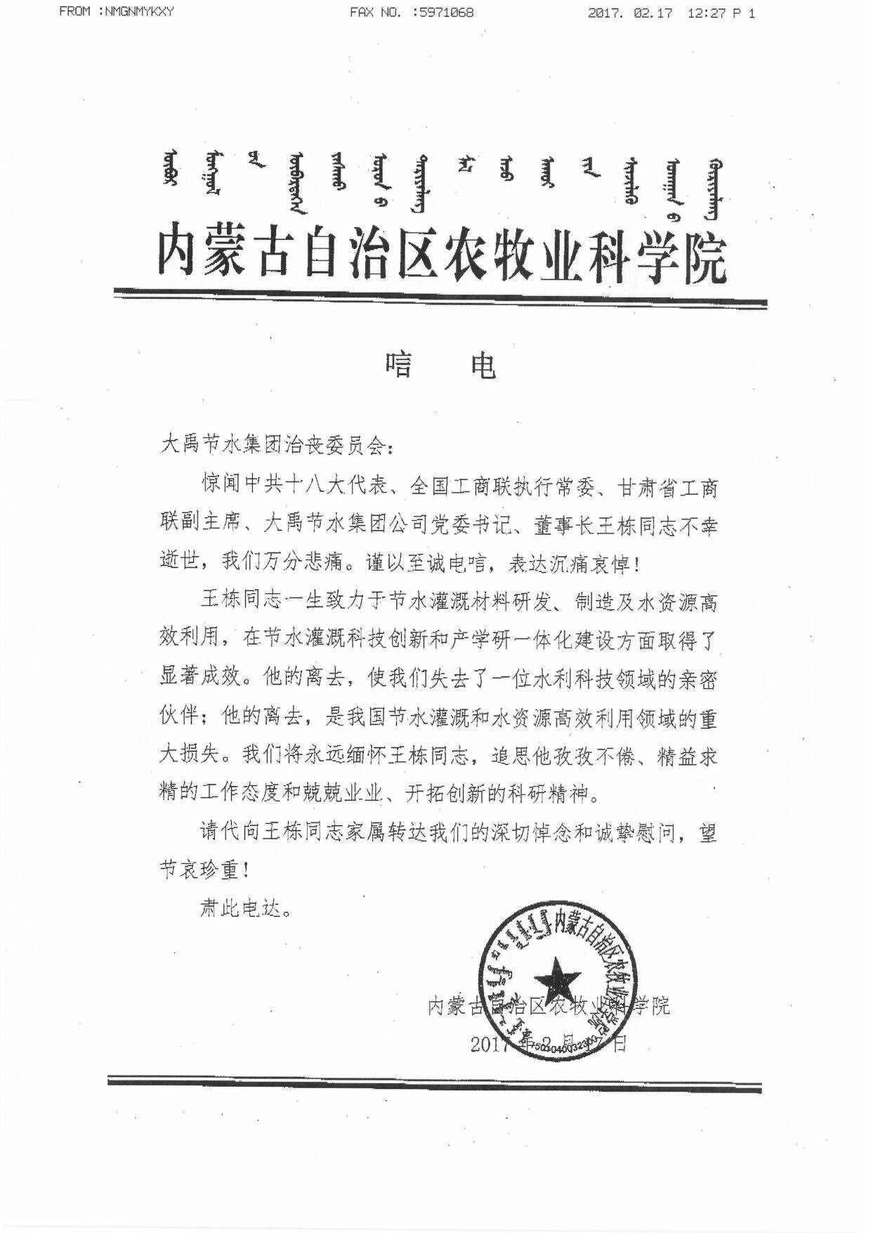 内蒙古自治区农牧业科学院唁电