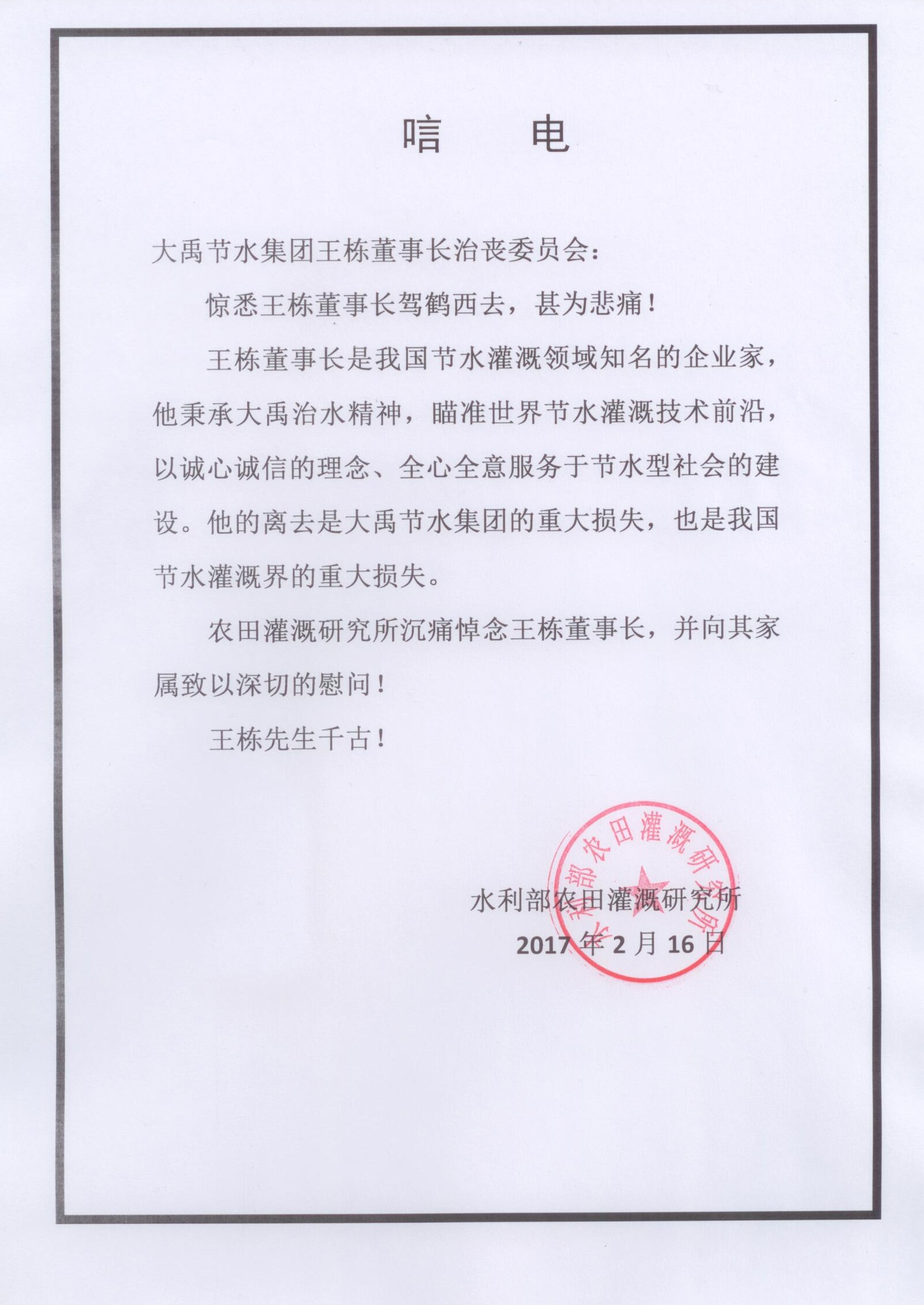 水利部农田灌溉钻研所唁电