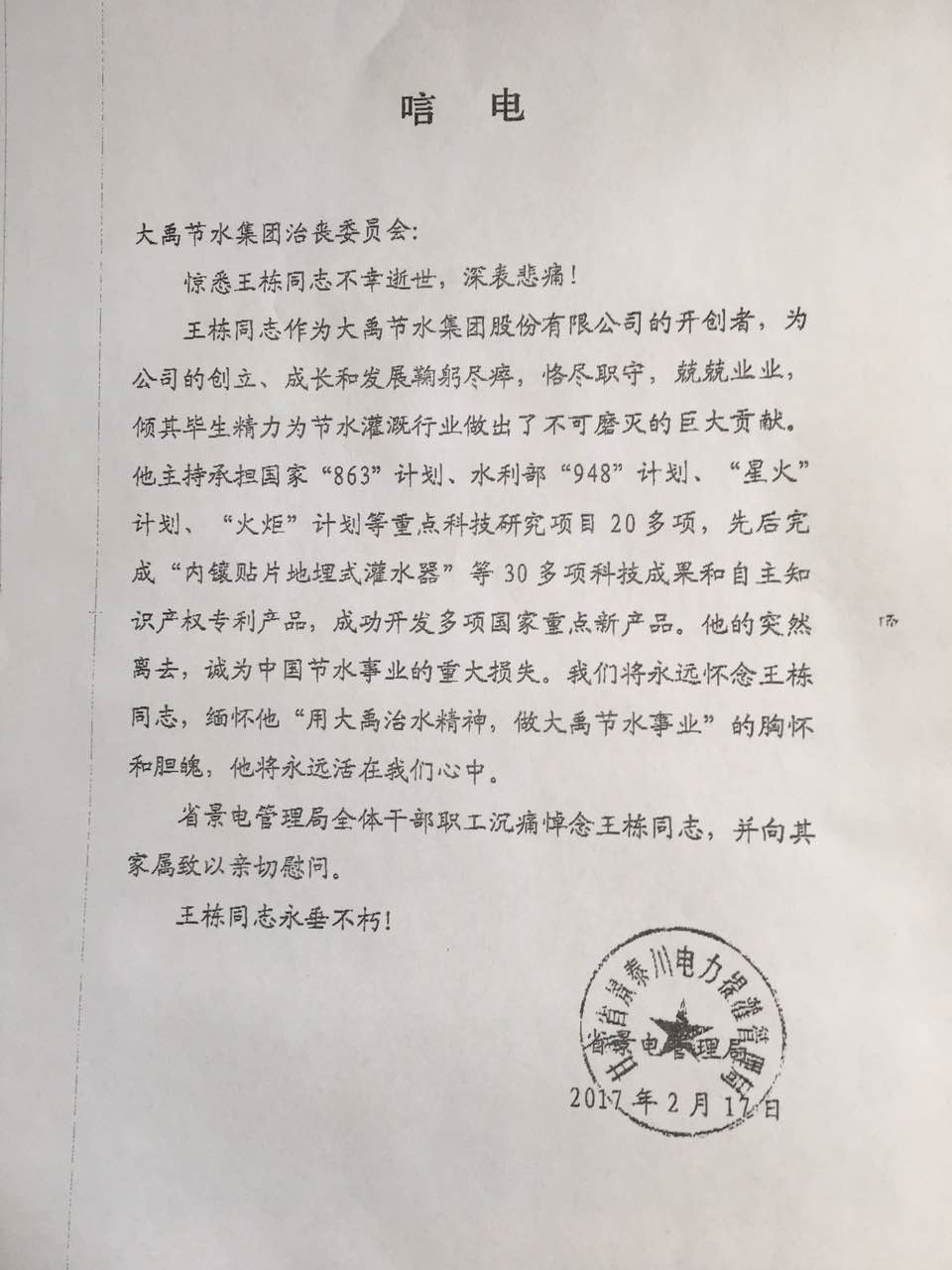 甘肃省景泰川电力提灌治理局唁电